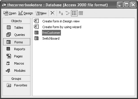 If you switch to Forms in the Database window, you should have a form listed called Switchboard, as shown in Figure 3-14. If you open it, it should look something like Figure 3-15.
