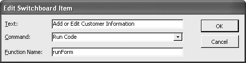 In this case I added the wording for the menu item: Add or Edit Customer Information. For the Command, I selected Run Code. Finally, I specified that I want to run the runForm procedure. (Note that the name of the field, Function Name, is unfortunate; it implies, falsely, that you can only run functions.) I could have specified any arguments I wanted passed to the procedure also. We will talk about the implications of that in a few moments. However, for now, click OK.