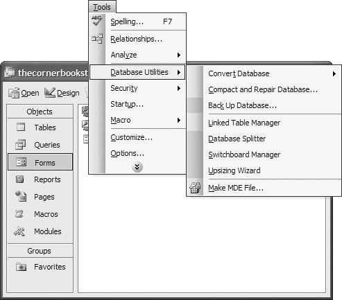 As a user, you interact with most programs through the use of menus and toolbars. Both menu bars and toolbars come under the broad category of command bars. Figure 4-1 shows a typical Access menu.