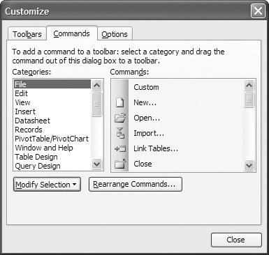 While you are in the Customize dialog box, you can select a button on a displayed toolbar and remove it from the toolbar by simply dragging it off. If you want to put a new button on the toolbar, you first select the Commands tab in the Customize dialog box, as shown in Figure 4-3.
