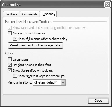 Some people do not like that option. If you want to shut it off, go to the Options tab in the Customize dialog box and check the Always Show Full Menus option, as shown in Figure 4-4.