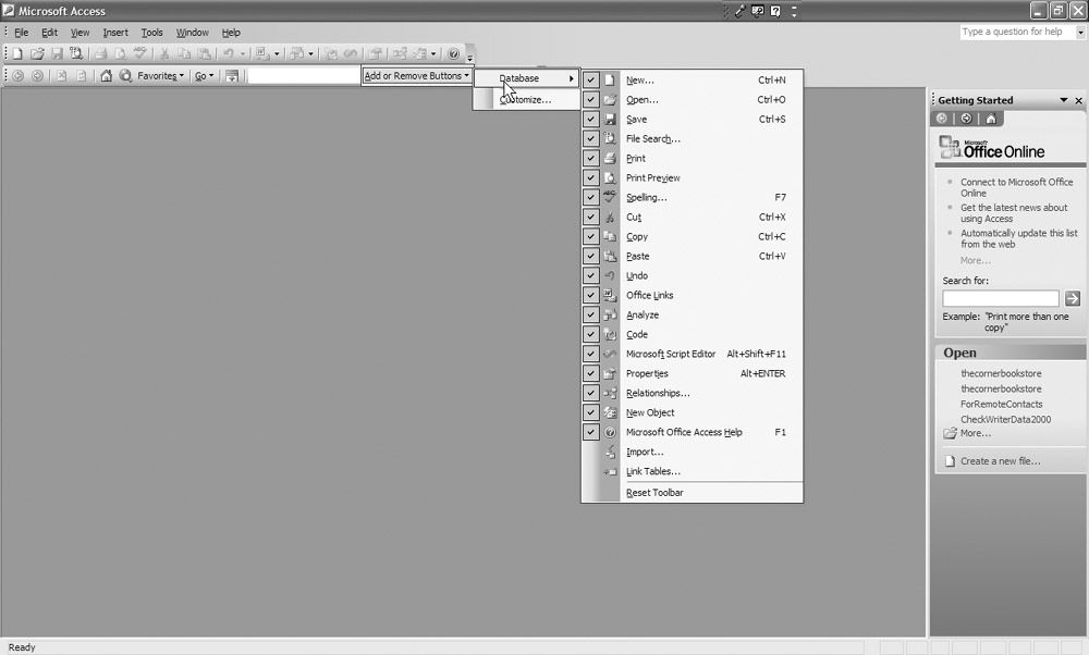 You can also customize a toolbar by selecting the down arrow located at the right end of the bar. If you’re working with the Database toolbar, for example, you can click the arrow and then select Add or Remove Buttons | Database. You should see the button list shown in Figure 4-5.