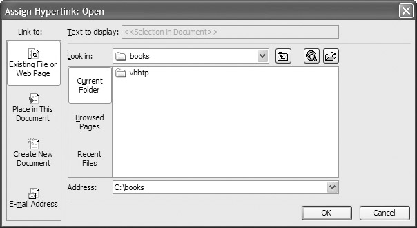 You can also set the button image and colors. It is worth your time to explore some of the options available. Of particular interest is the Assign Hyperlink option, which opens the dialog box shown in Figure 4-6. Here you can assign the button a link to a file, web page, or even an email address. This will come in handy when you build a customized toolbar.