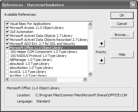 Scroll down and click on the object libraries as shown in Figure 5-1. If your version of ADO does not go up to version 2.7, as shown in the figure, don’t worry about it. Just click on the highest number version that you have. Do the same for the Microsoft Office 11.0 Object Library.