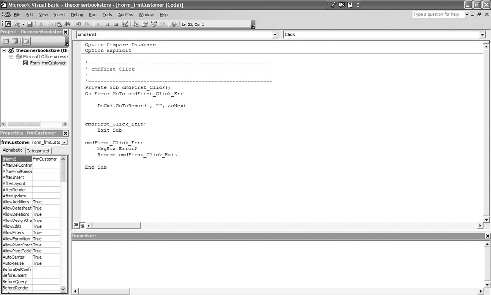 Right below the Project window is the Properties window, shown in Figure 5-3. In the example, this shows the various properties that can be set for frmCustomer. Setting them in a menu saves a lot of coding. Along the bottom of the VBA Editor is the Immediate window. You use this to test your code. In the course of this book, we will spend a lot of time in this window.