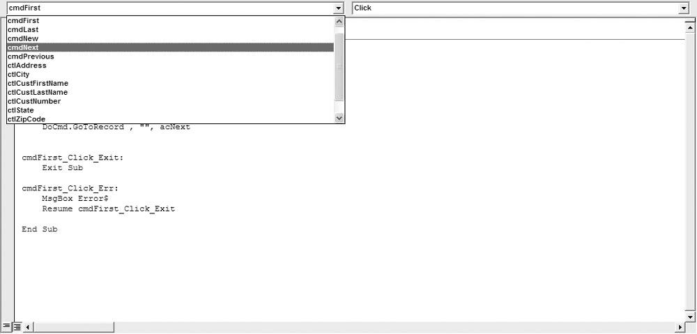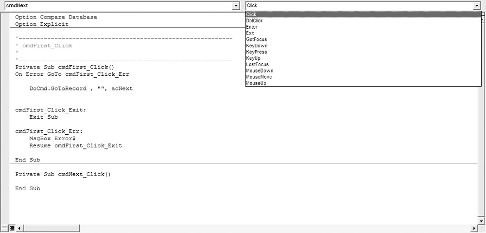 Up to this point, the only module in our VBA Editor is a form module that was created when we converted a macro to VBA code in Chapter 3. For the moment, let’s imagine that the form module is there with absolutely no code on it, and that you want to create a click procedure for the cmdFirst button. How would you do it? Let’s walk through the process.