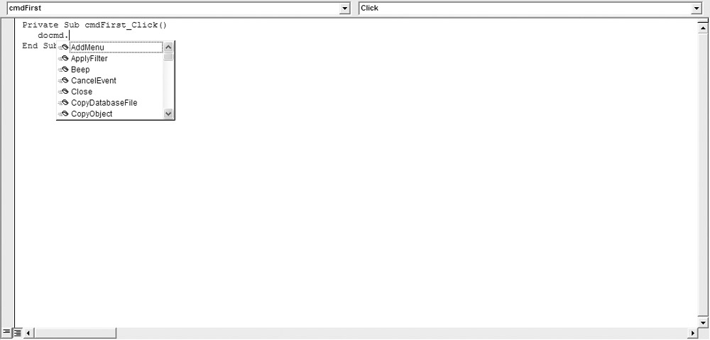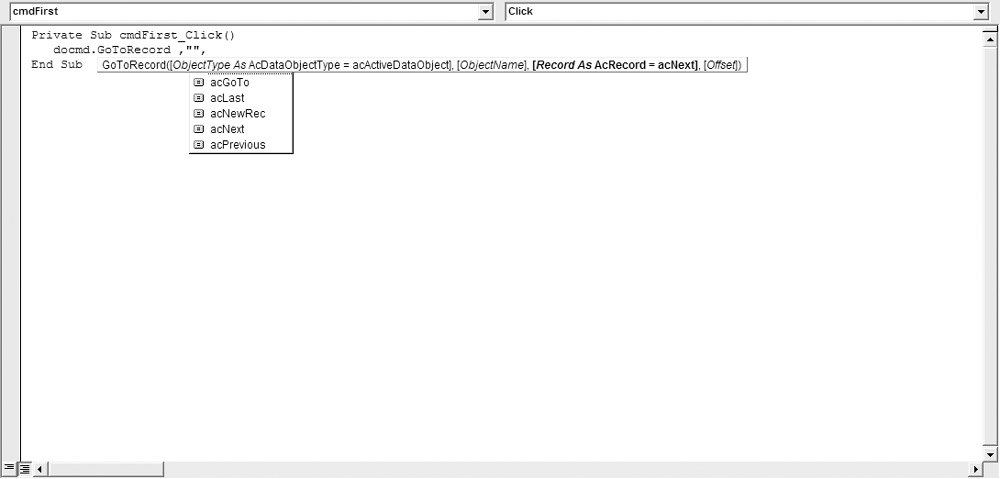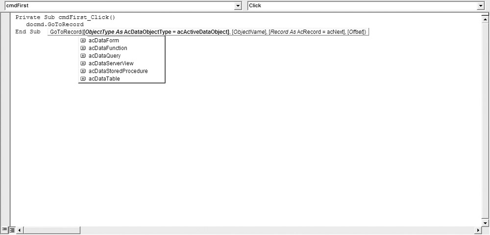 Note that these are not methods. There is a different icon to the left. It is a good idea to become familiar with these icons. Scroll up and select acFirst from the list and press the SPACEBAR.