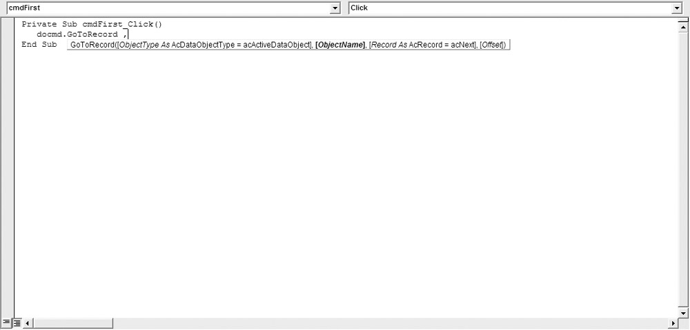 Once you press the SPACEBAR to select GoToRecord, your Code window should look like this: