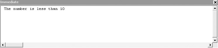 Sub ifTest() Dim intNum As Integer Dim strMessage As String intNum = 9 If intNum > 10 Then strMessage = "The number is greater than 10" Else strMessage = "The number is less than 10" End If Debug.Print strMessage End Sub