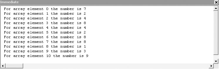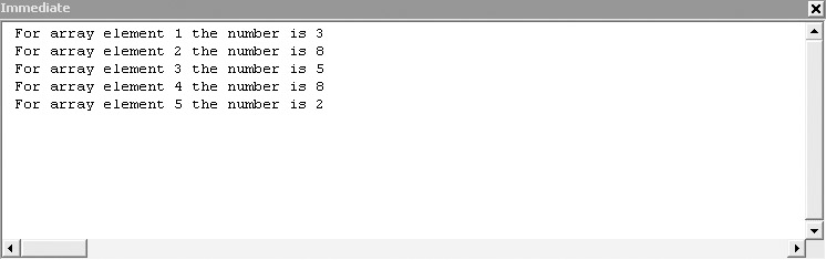 Debug.Print "For array element " & i & " the number is " & _