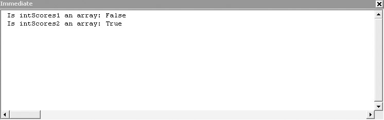 Sub arrayTest() Dim intScores1 As Integer Dim intScores2(4) As Integer Debug.Print "Is intScores1 an array: " & IsArray(intScores1) Debug.Print "Is intScores2 an array: " & IsArray(intScores2) End Sub