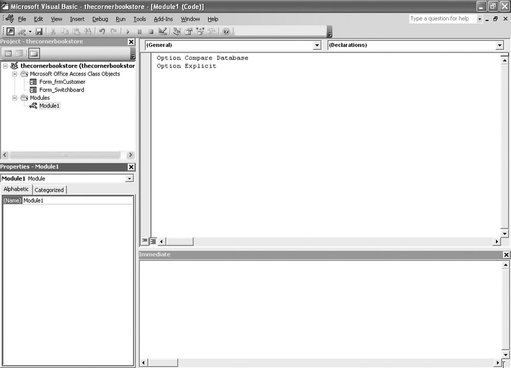 The Project Explorer window, the window on the upper left side of Figure 7-1, contains not just the list, but the hierarchy of code objects for the project. The Properties window, on the lower left side in Figure 7-1, contains a list of properties associated with an object, such as a form or report, and what their current settings are.