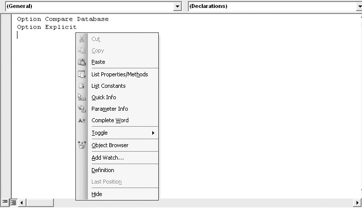 In addition to using the individual menus, you can right-click in the Code window and get a list of commonly used menu items, as shown in Figure 7-2. This is a static menu that offers one-click access to some common menu commands. It is not a dynamic menu whose contents reflect menu items that you’ve recently selected.