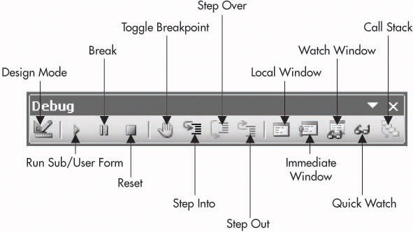 In addition to the menu commands, you will be using several toolbars in your work. Besides the Standard toolbar, the Debug, Edit, and UserForm toolbars will be referred to throughout the rest of this book. Let’s take a look at them here.