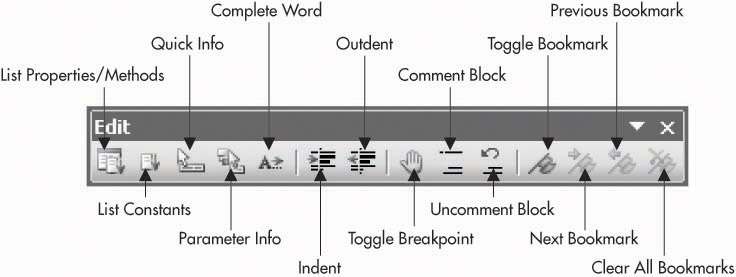 The Edit toolbar provides tools for editing code. Its buttons duplicate options found mostly on the Edit menu, like List Properties/Methods, Indent, and Outdent. In addition, it contains a Toggle Breakpoint button, which is also found on the Debug menu. Finally, it has a Comment Block button to comment out lines of code so that they do not execute, and an Uncomment Block button to remove comments from lines of code so that they do execute. These two buttons have no menu equivalent: