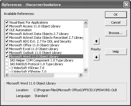 Before a library can be seen in the browser, a reference to it must be created. To do this, you need to open the References dialog box by selecting Tools | References. The dialog box that opens looks something like Figure 7-10.