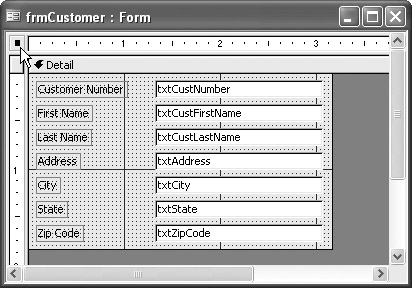 Our sample database (available on www.osborne.com) contains a form called frmCustomer. Let’s go ahead and open that in Design View, as shown in Figure 8-3. Notice that the mouse pointer is pointing to the small black square located in the upper-left corner of the form.