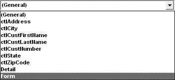 The explanation is easy. A control is an object on the form. In this case, it is a text field that holds the information from the field txtCustLastName. It is not the table field itself, however. As a matter of fact, if you open the form in Design View (if it isn’t already), click on the control, and go to its properties, you will see the name of the control at the top, as shown in Figure 8-6.