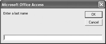 The input from the InputBox is used to assign a value to strLastName. As a result, when you save the code and open the form, you are first presented with the input box: