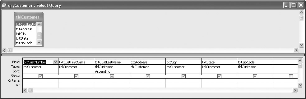 What you may not have realized is that Access was writing SQL in the background for you. Let’s see an example. Start a new query object in Access, and select the tblCustomer object for the table. If you add some columns, a sort, and a possible search criterion, your screen should look something like Figure 8-9.