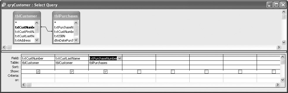Beginning with the FROM clause, you name the first table and then add a second table with INNER JOIN. However, you need to specify how the two tables can be linked. In this case, the txtCustNumber field of the tblCustomer table is linked with the txtNumber field of tblPurchases. Notice that the two fields do not have to have the same name. Notice, also, that you had to specify the originating table of the fields.