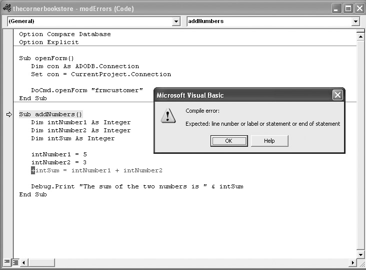 Once you have written a program well, nothing ever goes wrong. True or false? I don’t think it would come as a surprise to anyone that the answer is false. In fact, a lot can go wrong that has nothing to do with the quality of the coding. As an example, as mentioned in previous chapters, you could open databases in different locations. What would your program do if the database file was missing from the location you indicated? What would happen if the database file was where it should be, but someone modified it, and a table or form being called was missing?