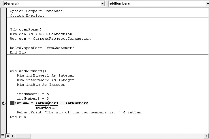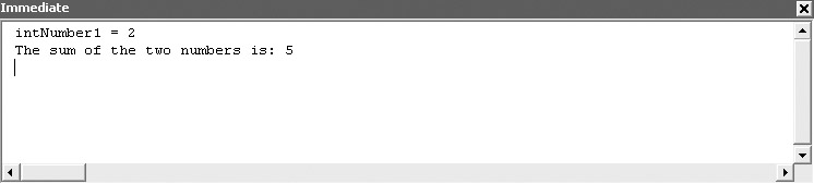 Sub addNumbers() Dim intNumber1 As Integer Dim intNumber2 As Integer Dim intSum As Integer intNumber1 = 5 intNumber2 = 3 intSum = intNumber1 + intNumber2 Debug.Print "The sum of the two numbers is: " & intSum End Sub