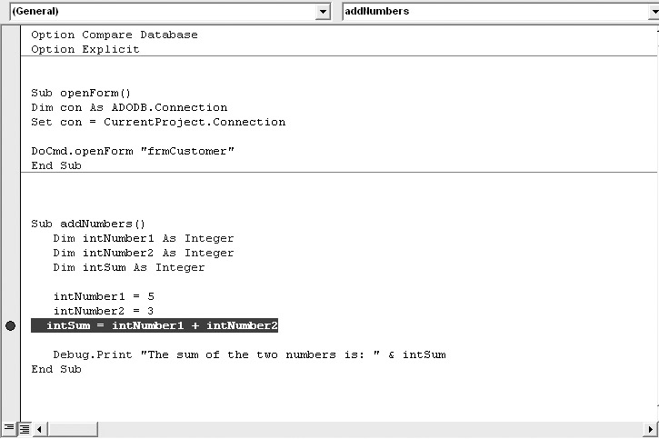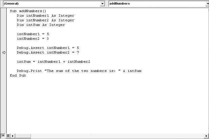 Sub addNumbers() Dim intNumber1 As Integer Dim intNumber2 As Integer Dim intSum As Integer intNumber1 = 5 intNumber2 = 3 Debug.Assert intNumber1 = 5 Debug.Assert intNumber2 = 7 intSum = intNumber1 + intNumber2 Debug.Print "The sum of the two numbers is: " & intSum End Sub