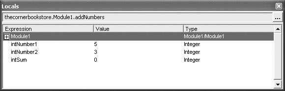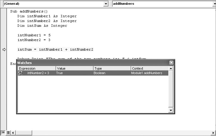 Here you find the assigned values, at that point, for the two variables. Since the code was halted before the addition took place, intSum is showing a value of 0. You can also click on one of the values, change it, and press ENTER. This will assign a new value to the variable in much the same way that you did in the Immediate window earlier.