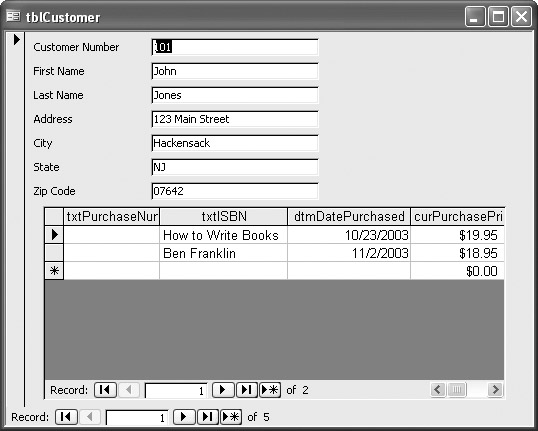You can select Create, then save and close the Relationships window. If you now click on tblCustomer, and use the AutoForm, it should look like Figure 12-3. The outer form is tblCustomer, and the inner form holds the related records of tblPurchases. Each has its own navigation bars.