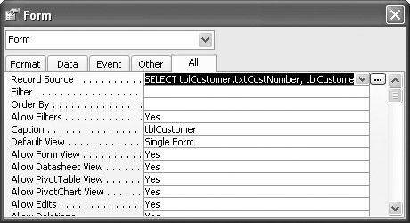 Access allows you to base forms on either tables or queries. However, beginning with Access 2000, you can build SQL statements and recordsets directly into the form structure. As an example, let’s switch the form we just created and saw in Figure 12-1 to Design View. Once there, select View | Properties. The resulting dialog box, with the All tab selected, is shown in Figure 12-4. You can see that the Record Source is tblCustomer.
