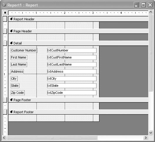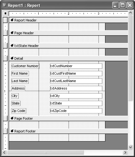 If you close this box now, the Design View of the report will reflect the new grouping section, as shown in Figure 13-2. You could then drag the txtState column, and related label, up to that grouping section. If you wanted to, you might have another grouping within the txtState grouping that reflected, perhaps, the txtZipCode column. The possibilities are many.