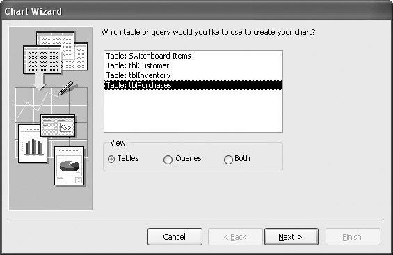 Let’s begin by using AutoReport for tblPurchases, and then open the report in Design View. Once there, select Insert | Chart. If you bring your mouse pointer down to the Report Footer area, you should see the chart icon attached to the mouse pointer. Just click in the footer area. This should open a new wizard, as shown in Figure 13-9.