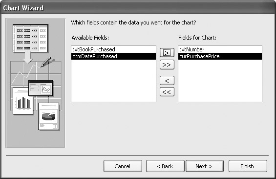 As you can see in the first screen of the wizard, tblPurchases is selected. You also could have based the chart on a query. After selecting Next, you decide what fields you want to use. In this case, we want txtNumber and curPurchasePrice, as shown in Figure 13-10. After selecting Next, you need to select the type of chart. The wizard gives you a choice of many different kinds of charts, but will automatically select one that seems appropriate. In this case, a 3-D column chart is selected, and this works well.