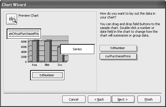Select Next again, and the Chart Wizard brings you to the chart layout screen. As seen in Figure 13-11, Access made some default decisions. It decided to place the txtNumber field in the category, or x, axis and a calculated field, sumOfcurPurchases, in the value, or y, axis. For purposes of this example, we’ll leave it at that.