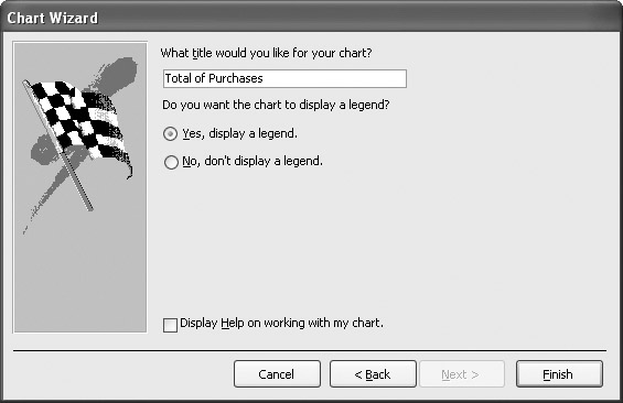 Since the total is a separate object inserted into the report, you have to give it a name. After selecting Next, you are taken to a screen to name the object, as shown in Figure 13-13. Once again, the name you enter here—Total of Purchases in the example—is the name that goes on the chart. Note also that the chart’s legend is turned on. Now when you select Finish, you will see the Design View with the chart, as in Figure 13-14.