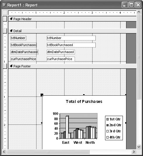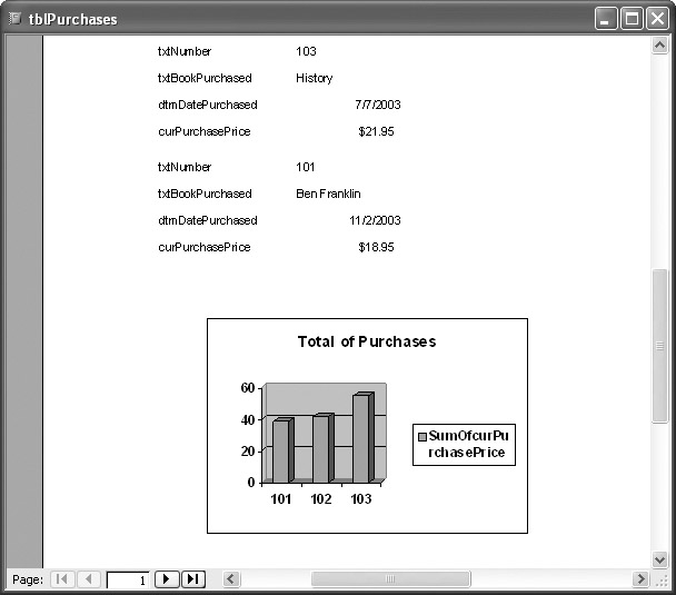 You can easily add a chart to a report. Admittedly, our little bookstore has only a few customers, and their purchases are located in the tblPurchases table. Let’s assume we want to create a report of their purchases and then append a chart at the end of the report in the report footer.