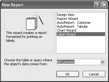 You can access the Label Wizard through the Reports Objects window. Once there, you begin by selecting New. You are taken to the first step, as shown in Figure 13-16. Here, the wizard is selected, with tblCustomer as the data source. After selecting OK, you are taken to a screen that allows you to pick the label type you want to use. You will be able to choose from the common Avery labels that come on sheets with three across.