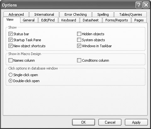 The following sections give you the strings corresponding to the settings in each tab of the Options dialog box. Note that all of the options are found in Access 2003, although they are not all found in earlier versions.
