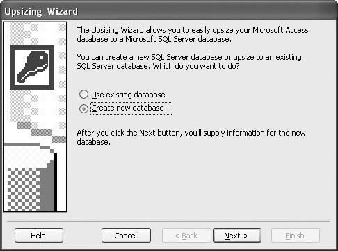 Here you can either create a new SQL Server database or use an existing one. In most cases, you are going to create a new SQL Server database to put your existing Access database into.