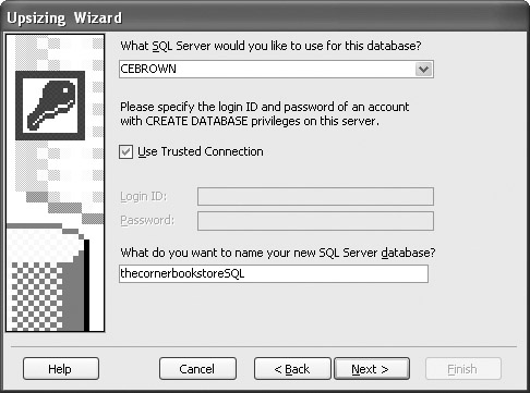 You need to select the name of the server where SQL Server resides. In most cases, there is only one name. However, in very large applications, there could be multiple instances of SQL Server. You also need to provide a name for your database. By default, the wizard uses the name of the Access database with the string “SQL” appended to it.
