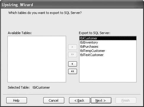 Once you complete the options, and select Next, you are asked to select the tables you want to upsize to SQL Server (step 3). In this example, I used the double right- pointing arrows to select all of the tables from the Access database.