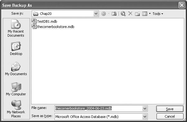 Before using the splitter and dividing your database application into components, it’s best to make a backup copy of your original database. To do this, select File | Back Up Database. Access closes the open database file and opens the Save Backup As dialog box, a standard File Save dialog box. As you can see in Figure 20-2, Access suggests a filename that consists of your original database filename along with the date of the backup. Feel free to assign a filename and a directory of your choice. Then select the Save button to begin the backup. When the backup is completed, Access will reopen the original database.