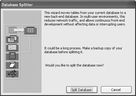 To address this issue, Access (from Access 97 on) offers a utility that allows you to split your database into a front end that resides on the user’s desktop and a back end that resides on a single machine and is shared by all users of the application. Called the Database Splitter, this utility can be accessed by selecting Tools | Database Utilities | Database Splitter.