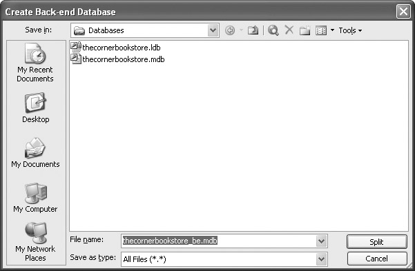 When you launch the Database Splitter Wizard, Access displays the dialog box shown in Figure 20-3, which allows you to cancel the operation if you’ve forgotten to back up your database or if you’ve launched the wizard in error. If you select the Split Database button, Access prompts you to select a name and location for the back-end part of the database, as Figure 20-4 shows. This consists of the Access objects that you will store on a single system (your database server) and that typically are fairly dynamic, such as your nonstatic database tables. In forming a recommended filename, Access simply adds the substring “_be” to your existing filename. You can change it or accept the default. Click the Split button when you’re satisfied with the name and location of your back-end database component.