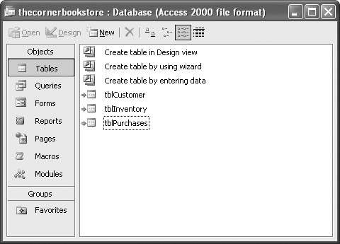 Eventually, depending on the number of objects in your database and its size, Access should display a dialog box informing you that the database has been successfully split. This means that your Access database (.mdb) file has been separated into two distinct files: all tables have been saved in the back-end database file, while all queries, forms, reports, macros, and modules have been saved in the front-end file. This front-end file is a modified version of your original database file (in our case, thecornerbookstore.mdb), except that its tables have been removed. This is indicated by the icon beside each table in the front-end database’s Tables window, shown in Figure 20-5, which shows that links to the tables have replaced the tables themselves.