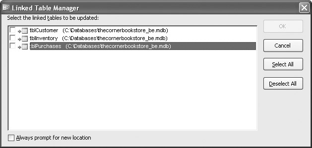 To correct this problem, Access provides the Linked Table Manager, which you can activate by selecting Tools | Linked Table Manager, or by right-clicking on one of the front-end linked tables and selecting Linked Table Manager from the pop-up menu. Access then opens the Linked Table Manager dialog box, shown in Figure 20-6. The dialog box lists the linked tables in the current database and shows the location of the physical tables to which they point. You can select the links that you’d like to update, then click the OK button. Access will then display a File Open dialog box that prompts you for the new location of the back-end database file. If Access finds all of the physical tables in the file you’ve selected, it will update the remaining links as well. Otherwise, it will prompt you for each remaining table whose link it can’t resolve.