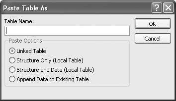Select Edit | Paste. Access displays the Paste Table As dialog box shown in Figure 20-7.
