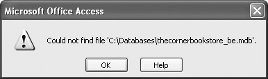 Once you’ve split the database into a front and a back end, you can copy the front-end file to individual users’ machines, as well as move the back-end database file to another location. Of course, moving either or both of these database files usually breaks the front-end database’s links to the back-end tables. For your application to work, you must update these links to reflect the current location of the back-end database. Otherwise, the front end of your application will simply be unable to locate the back end, and you’ll see an error dialog box like this one: