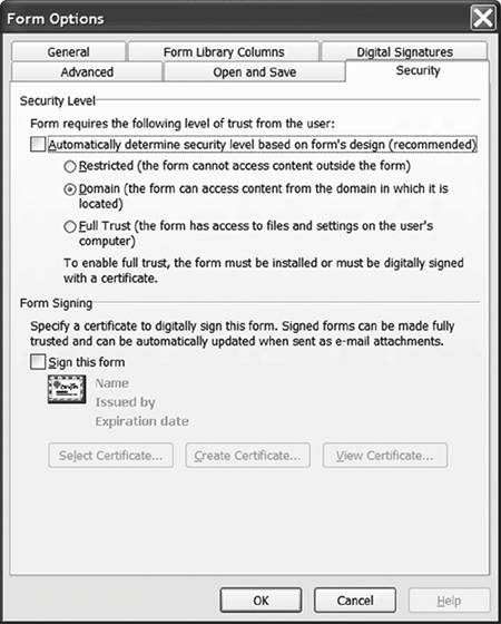To manually change the required security level of an InfoPath form, open the form template in design mode. Select the Form Options menu item located in the Tools menu, and click the Security tab as shown in Figure 12-6. Figure 12-6. Specifying the required security level for a form.